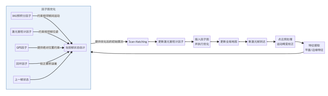 从底层原理看,LIO-SAM的运行流程是一个持续的预测-测量-优化循环: