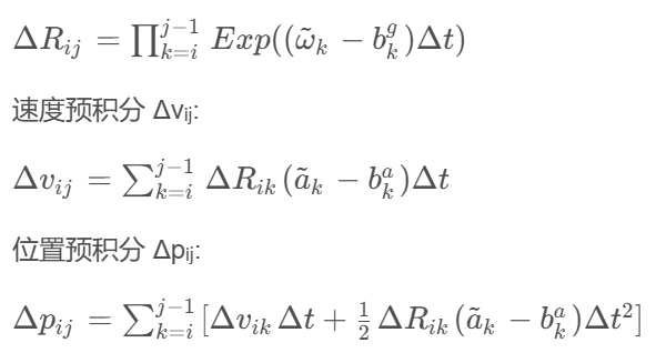 在时间间隔 [tₖ, tₖ₊₁] 内,对 i 个IMU测量值进行积分,得到预积分量 ΔRᵢⱼ, Δvᵢⱼ, Δpᵢⱼ,它们的定义是在机器人坐标系B(通常是IMU系)下的增量: