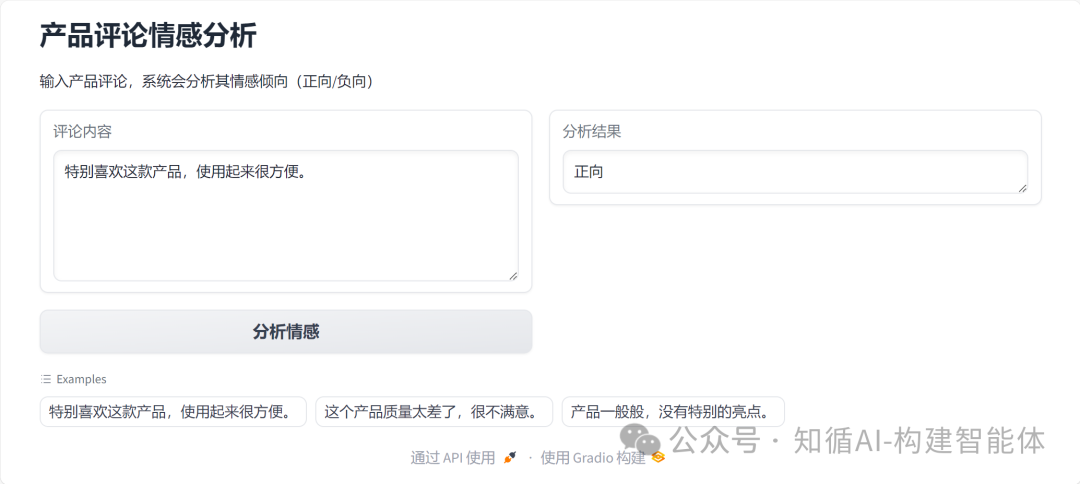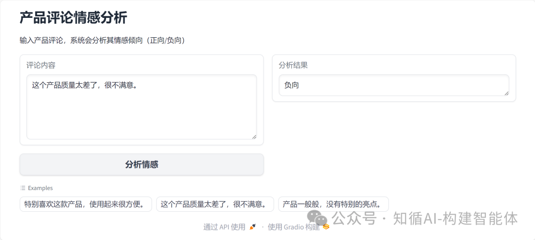 gr.Markdown("输入产品评论,系统会分析其情感倾向(正向/负向)")