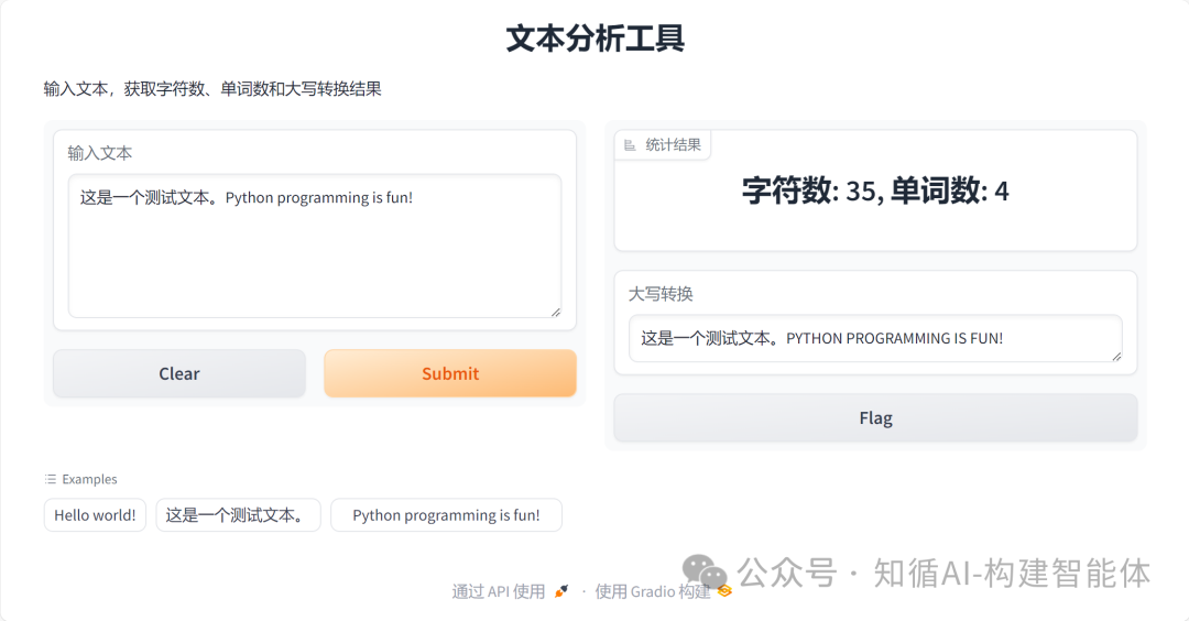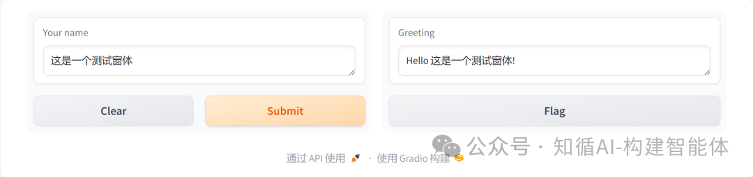 btn.click(fn=process, inputs=[input1, input2], outputs=output)本示例结合第一篇文章《构建AI智能体:一、初识AI大模型与API调用》中的示例,采用gradio组件开放调用,可以了解前后方式的差别;