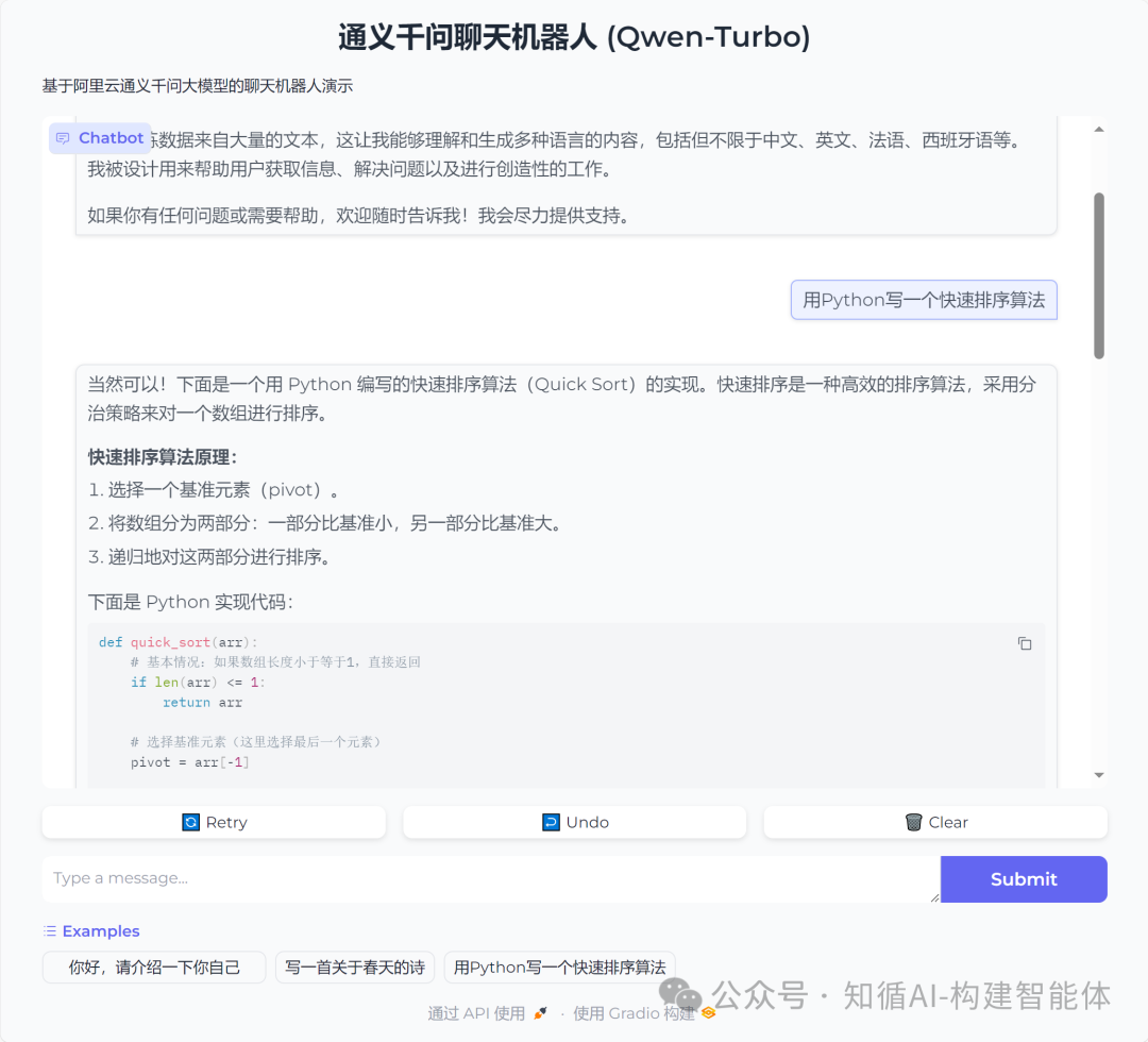 回顾前期文章中我们也通过AI编辑器自动生成了大模型调用的前端界面,但如果缺乏前端基础想要配置调试还是会遇到让人焦头烂额的问题,也需要一定的基础,现在我们指定Gradio来展示Turbo模型的自动问答系统示例,具体参考文中示例详细说明。