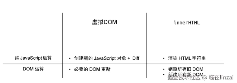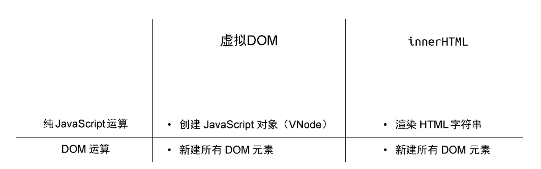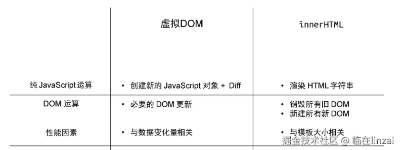 **虚拟DOM**创建页面的性能:**创建 JavaScript 对象的计算量** + **创建真实 DOM 的计算量**