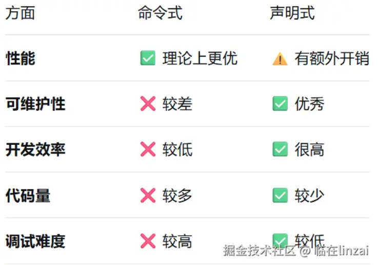 其实对于大多数业务应用,声明式的可维护性优势远大于其性能开销。而且随着框架优化技术的进步,这个性能差距正在不断缩小。这也是为什么vue,react这些声明式框架会成为主流