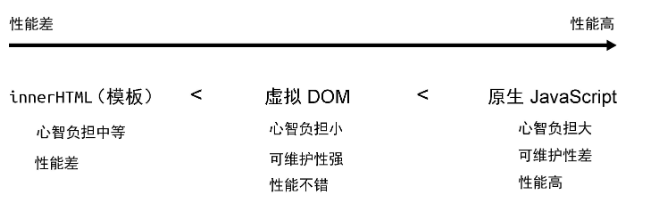 书中原话:innerHTML、虚拟 DOM 以及原生 JavaScript 在更新页面时的性能我们分了几个维度:**心智负担**、**可维护性**和**性能**
