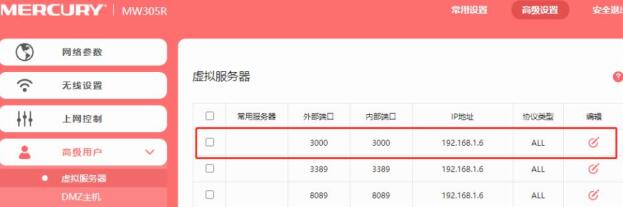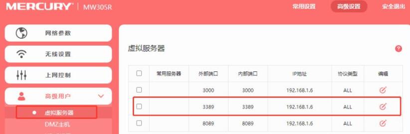 以水星路由为示例,在路由管理后台的高级设置->高级用户->虚拟服务器,添加一条内映射到内网主机的地址,将内部主机远程端口映射到外网访问。