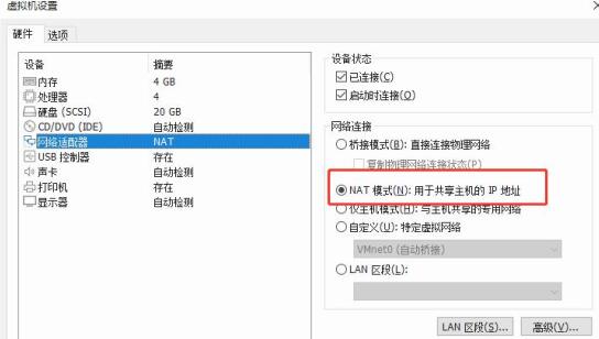 VMware有三种网络连接模式:桥接(bridged)、NAT和Host-only。这里需要选择NAT模式,因为虚拟机没有单独的IP可供使用,只能共享主机IP。