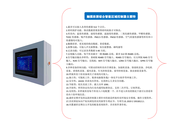作为档案馆 “八防(防火、防盗、防潮、防虫、防鼠、防高温、防光、防尘)、十防(增防霉变、防有害气体)、十二防(再增防氧化、防污染)” 环境监控系统的核心执行单元,智能综合一体化区域控制器以 “单库房独立管控、全参数联动调控” 为核心,整合环境监测、设备控制、异常预警、数据追溯于一体,替代传统分散式监控设备,实现档案存储环境的 “监测 - 分析 - 控制 - 记录” 全流程智能化闭环管理。