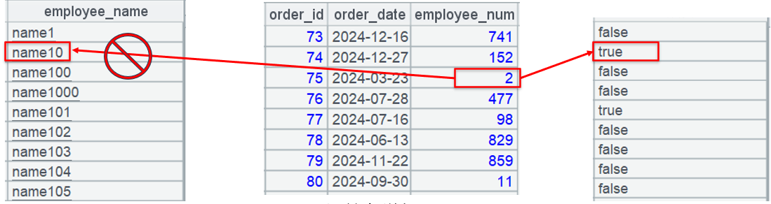 对订单表(图中间)过滤,常规计算是用 employee_num 去 employee 表(图左边)对应位置取 name,然后和 [“name10”,“name101”] 比较。