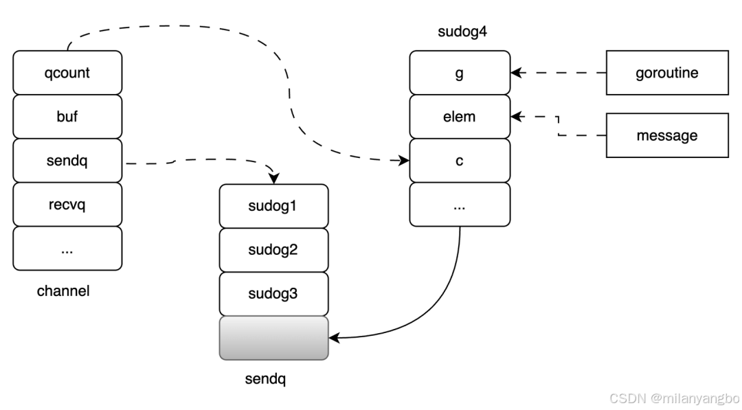 3)如果是阻塞发送,那么就将当前的Goroutine打包成一个sudog结构体,并加入到Channel的发送队列sendq里。