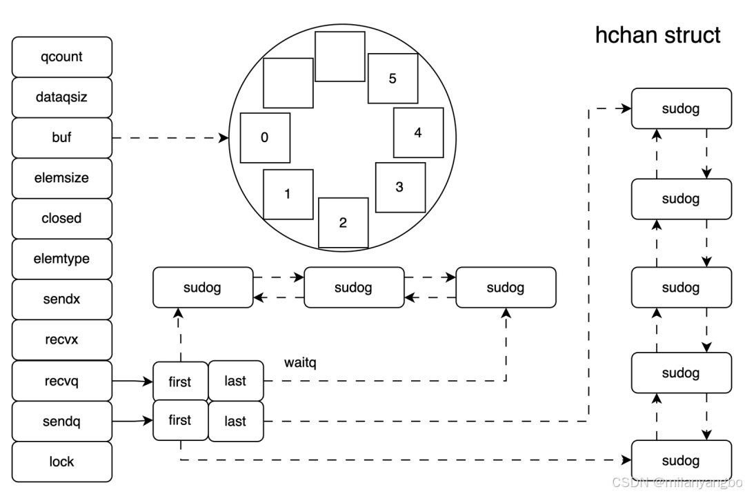 runtime.hchan 结构体中的五个字段 qcount、dataqsiz、buf、sendx、recv 构建底层的循环队列。除此之外,elemsize 和 elemtype 分别表示当前 Channel 能够收发的元素类型和大小。