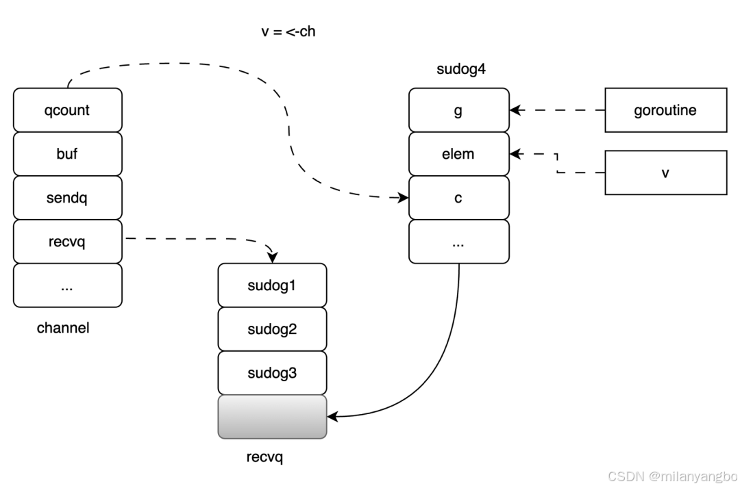 3)如果是阻塞模式,且当前没有数据可以接收,那么就需要将当前Goroutine打包成一个sudog加入到Channel的等待接收队列recvq中,将当前Goroutine的状态置为_Gwaiting,等待唤醒。