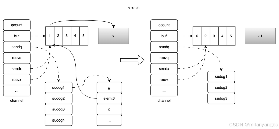 2)如果缓冲区buf中还有元素,那么就走正常的接收,将从buf中取出的元素拷贝到当前协程的接收数据目标内存地址中。值得注意的是,即使此时Channel已经关闭,仍然可以正常地从缓冲区buf中接收数据。