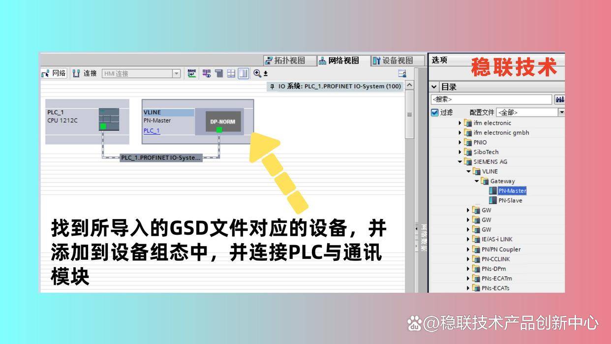 ③ 找到所导入的GSD文件对应的设备,并添加到设备组态中,并连接PLC与通讯模块