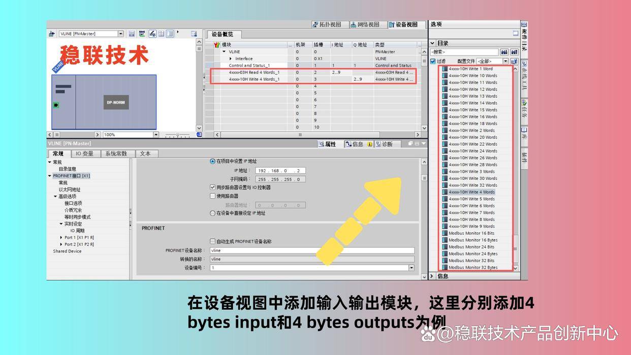 ⑥ 在设备视图中添加输入输出模块,这里分别添加4 bytes input和4 bytes outputs为例