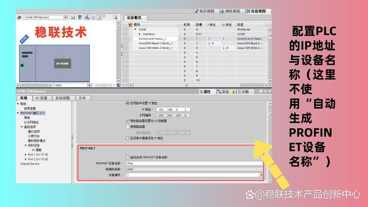 ④ 配置PLC的IP地址与设备名称(这里不使用“自动生成PROFINET设备名称”)