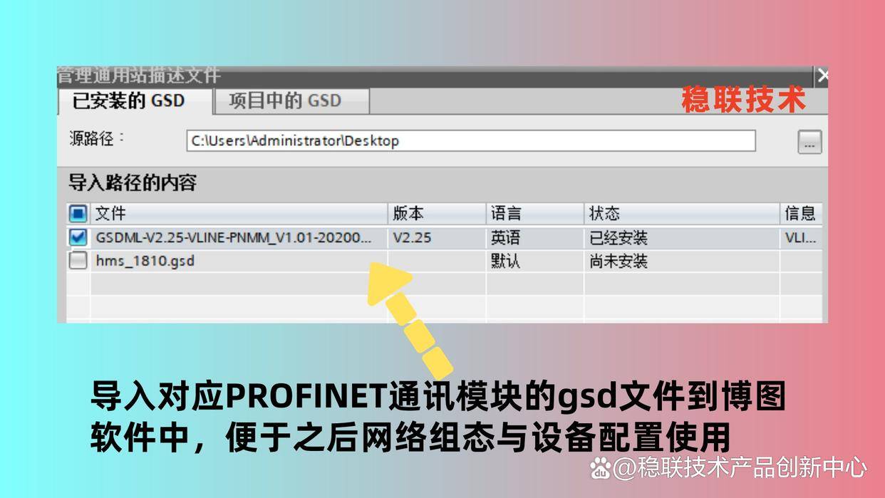 ① 导入对应PROFINET通讯模块的gsd文件到博图软件中,便于之后网络组态与设备配置使用