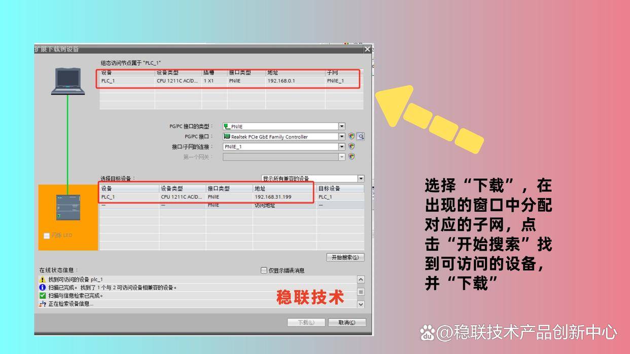 ⑧ 选择“下载”,在出现的窗口中分配对应的子网,点击“开始搜索”找到可访问的设备,并“下载”