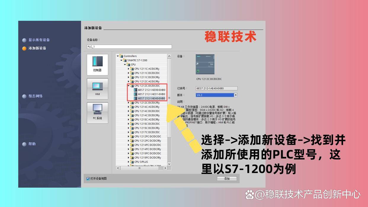 ② 选择–>添加新设备–>找到并添加所使用的PLC型号,这里以S7-1200为例