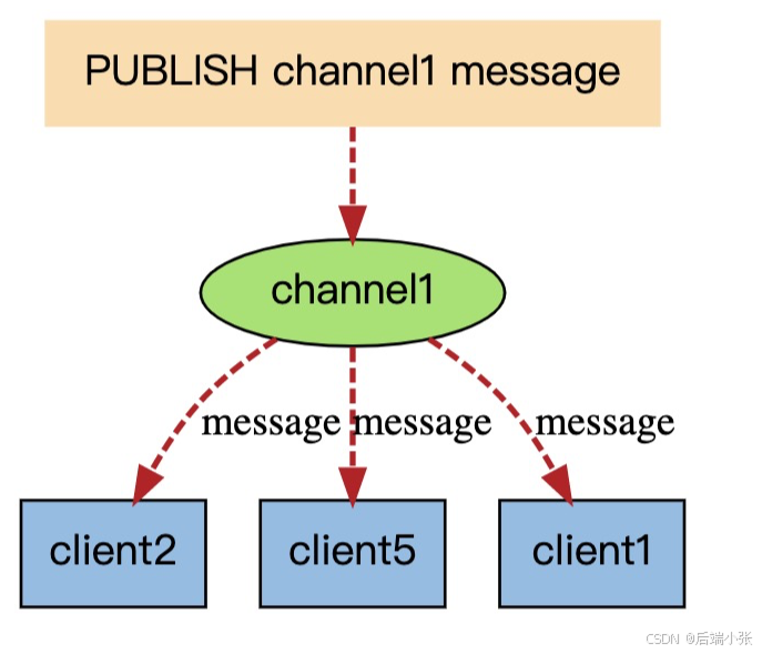 发布:首先根据 channel 定位到字典的键, 然后将信息发送给字典值链表中的所有客户端。