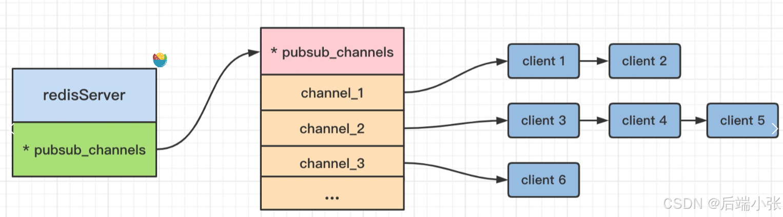 pubsub_channels是一个字典类型,保存订阅频道的信息:字典的key为订阅的频道, 字典的value是一个链表, 链表中保存了所有订阅该频道的客户端