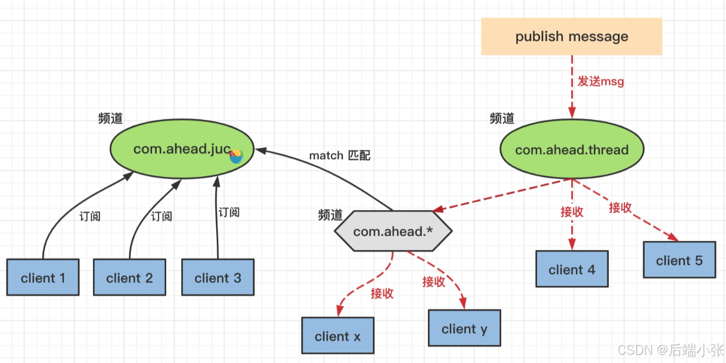 下图展示了一个带有频道和模式的例子, 其中 com.ahead.* 频道匹配了 com.ahead.juc 频道和 com.ahead.thread 频道, 并且有不同的客户端分别订阅它们三个,如下图: