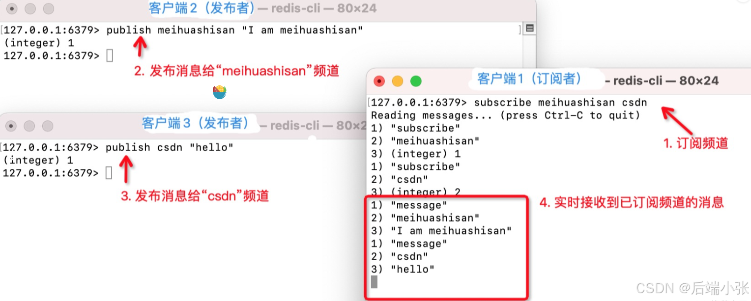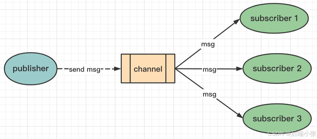 订阅者(listener)负责订阅频道(channel);发送者(publisher)负责向频道发送二进制的字符串消息,当频道收到消息时,推送给订阅者。