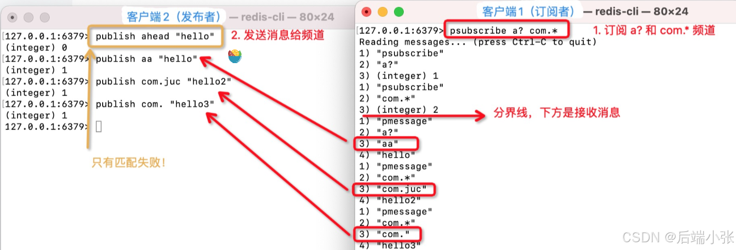 注意:订阅者已订阅 “a?” "com.*" 两种模式!