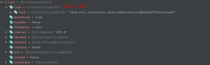 // 首先判断成员属性 lock 是否已被初始化。在 System.out 时就被静态代码块创建了
