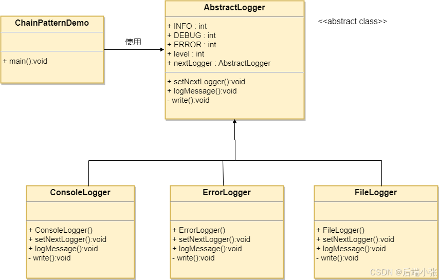 handleRequest)和一个指向下一个处理者的引用(后继者)。我们创建抽象类 AbstractLogger,带有详细的日志记录级别。然后我们创建三种类型的记录器,都扩展了 AbstractLogger。每个记录器判断消息的级别是否属于自己的级别,如果是则相应地打印出来,否则不打印并把消息传给下一个记录器。