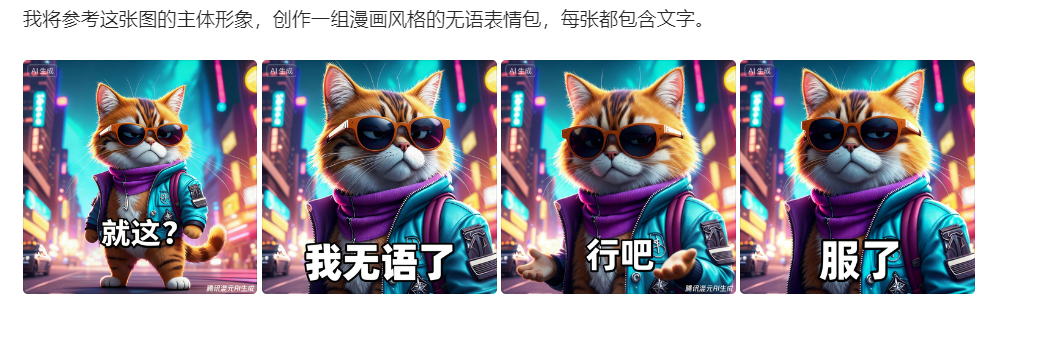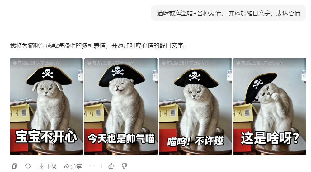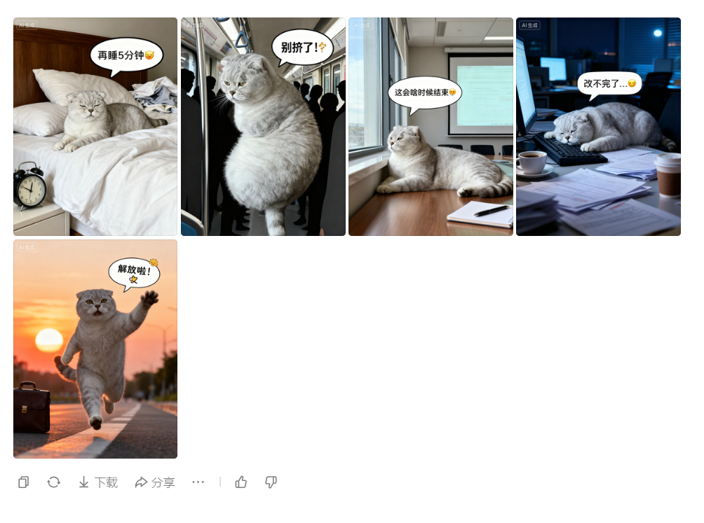 家里的猫咪总是摆着高冷脸?上传一张它的日常抓拍,输入“胖脸委屈求抱抱”,AI会自动保留猫咪的花纹和耳朵特征,生成脸颊圆润鼓起、眼神湿漉漉的委屈表情包;要是想玩反差萌,试试“穿西装打领带在咖啡厅办公”,橘猫秒变“社畜喵”,爪子搭在笔记本上的严肃模样,配上“这个方案今晚必须改完”的文字,直接戳中打工人笑点。更绝的是“体型定制”功能,给瘦弱小猫照片加个外扩箭头,就能生成圆滚滚的“猪咪”表情包,肉垫扑棱的样子让人忍不住保存。