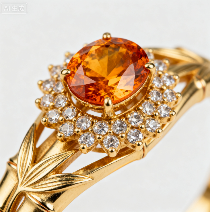 prompt:一款珠宝的微距特写,这款璀璨夺目的传世典藏级珠宝,以皇家级工艺打造,18K金手工微镶底座托举一颗宝石级主石,光影流转间尽显奢华典雅气质。每一颗辅石皆经严苛筛选,独一无二的设计灵感源自自然之韵与东方雅韵的融合,是身份象征,更是情感寄托的艺术臻品。限量发售,只为极少数真正懂得永恒之美的您。