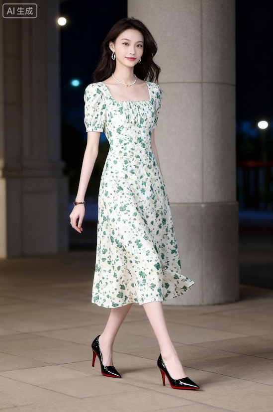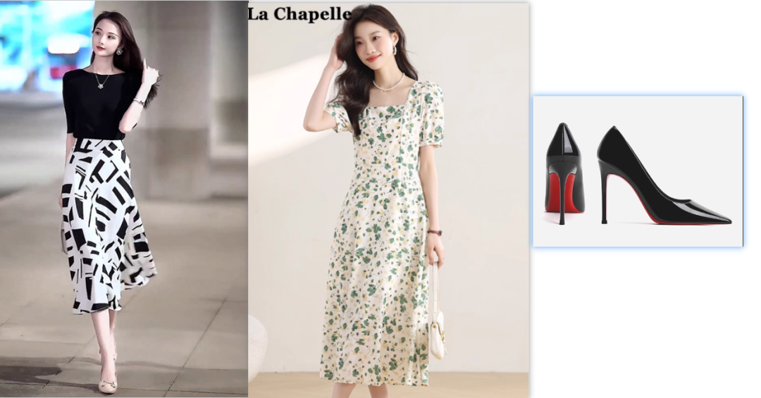 prompt:以第一张图的模特为基础,换上第二张照片的连衣裙和第三张照片的高跟鞋