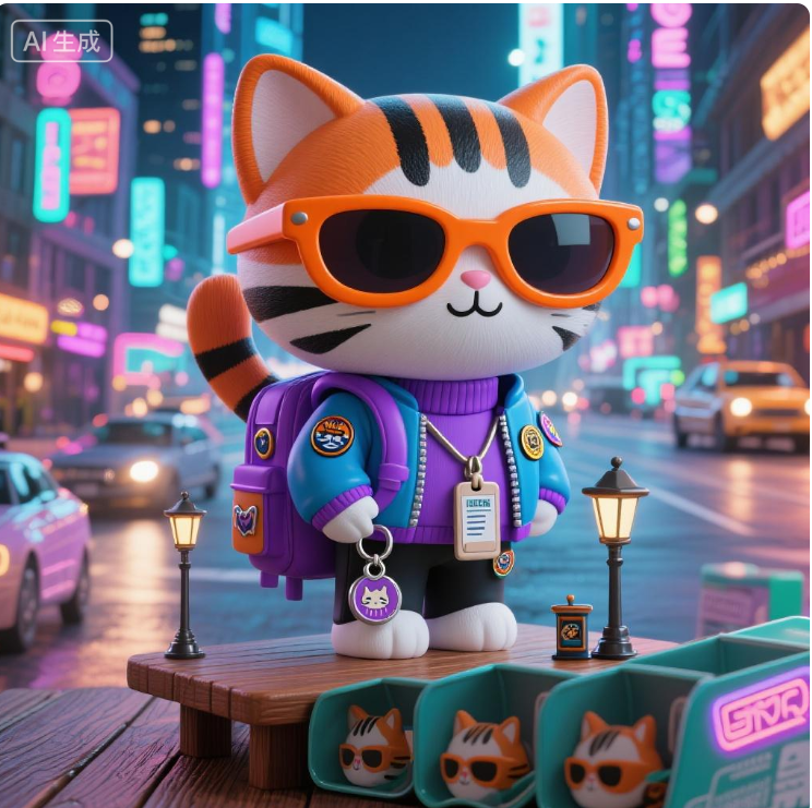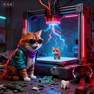 它把捡来的主板碎片、坏掉的耳机和半颗小孩掉的乳牙,偷偷藏进一台废弃的 3D 打印机。打印喷头用铜线做血管,以霓虹做脉搏,焊出一只跟自己一模一样的小小猫。启动瞬间,打印机发出猫啼般的电流嘶叫——那是它第一次听见自己的心跳被复制成另一颗。它给小猫取名“404”,因为这个世界早已找不到“家”的页面。