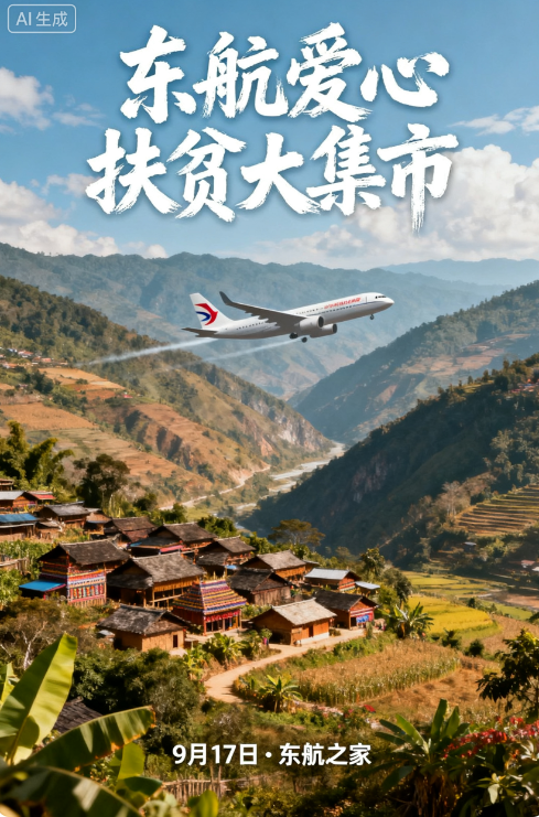 prompt:设计一张东航爱心扶贫大集市的海报,主视觉区采用云南佤族村寨风光+ 东航飞机剪影飞越山谷,请在海报顶部用中文毛笔字的飞白效果和书法笔触写下标题:“东航爱心扶贫大集市”,在海报最底部,用更小的字体标注时间和地点:“9月17日 · 东航之家”。