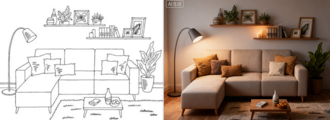 prompt:参考线稿图,生成实物场景