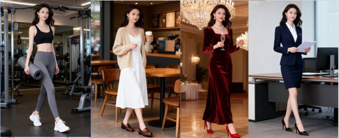 prompt:以模特为基础,生成四张穿搭照片,分别在健身房、咖啡店、办公室、高端酒席场景下
