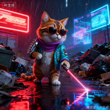凌晨 03:33,霓虹雨下的回收巷。朋克喵用一支捡来的激光笔划开垃圾山,让光束像刀口一样劈开黑暗。它不是在找食物,而是在寻找“被丢弃的光”——传说只要收集够七束,就能拼出通往旧世界的出口。此刻,第一束光正落在它金属义耳的铆钉上,像一颗不肯生锈的星。