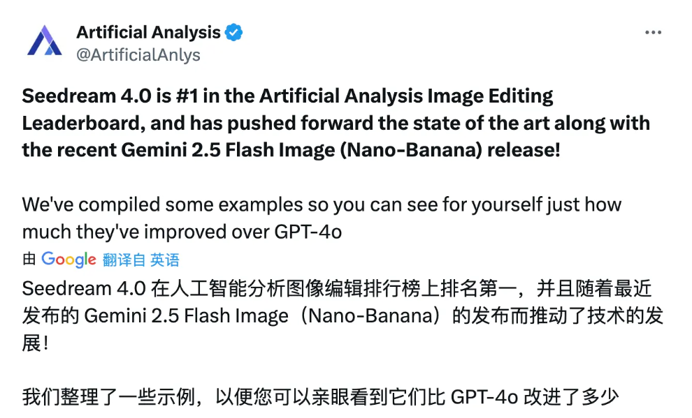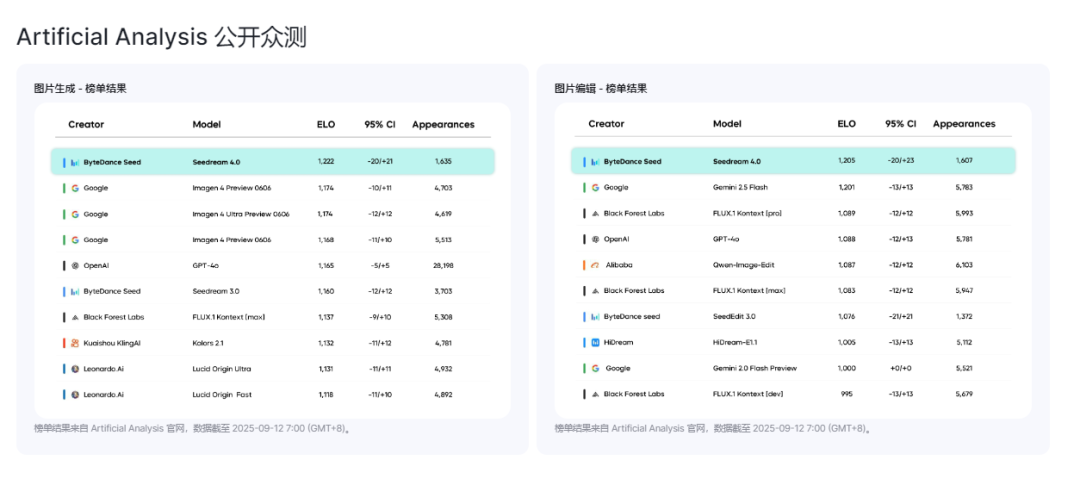 专业评测数据印证了其行业地位:在国际权威机构Artificial Analysis的「文生图」和「图像编辑」榜单中,Seedream 4.0一举拿下双榜首,超越谷歌Gemini 2.5 Flash(Nano Banana)等国际大厂产品。