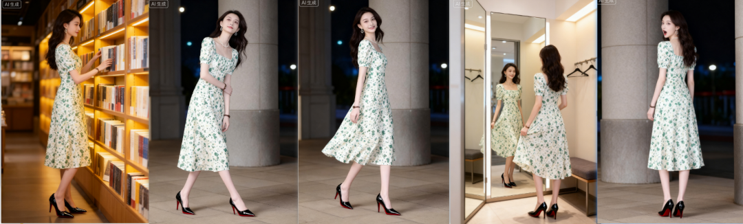 ✅ 元素提取 :跨图像提取人物、服装、场景等元素,实现“给A穿B戴C”的精准融合