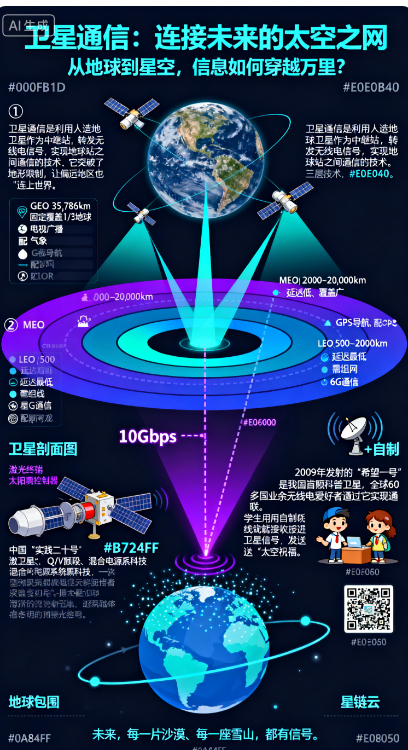 创作一幅关于卫星通信的科普知识信息图,🛰️ 信息图标题(顶部居中)
