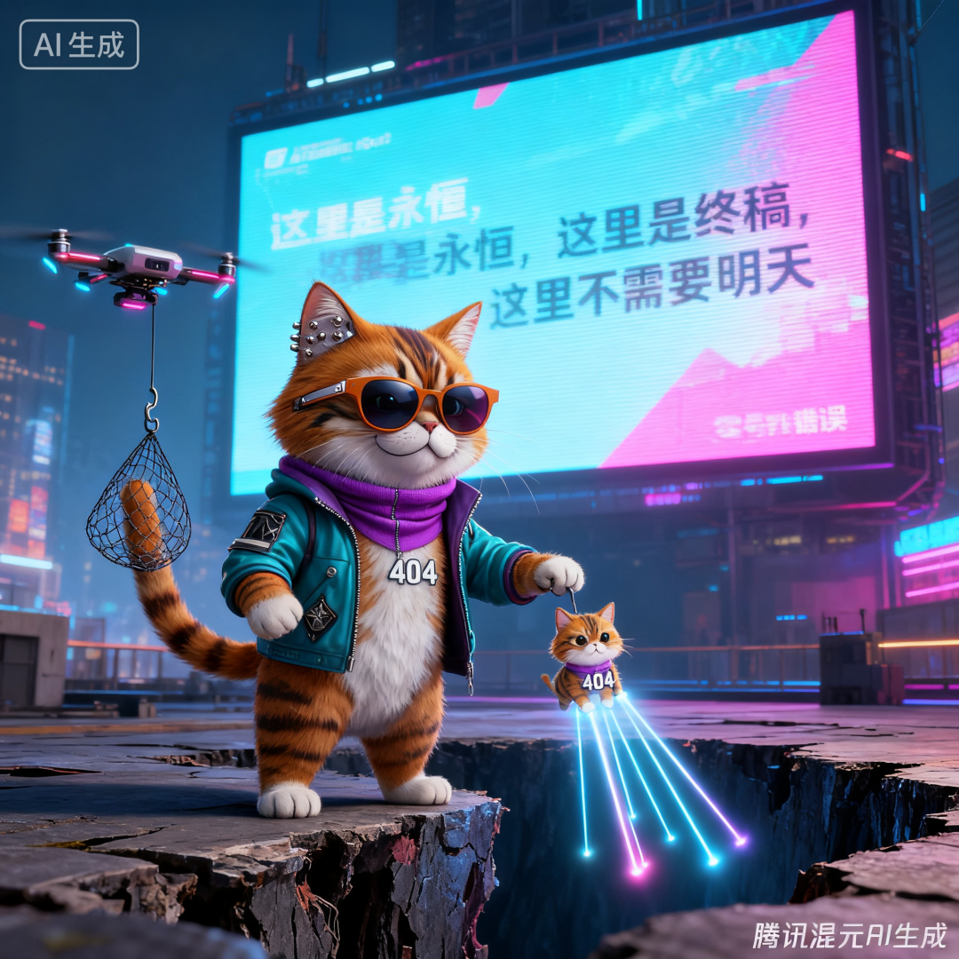 逃亡尽头是城市裂缝,一道被称为“零号错误”的空白地带。传说跳进去的数据都会变成“无”,但“无”比“被定义”更自由。朋克喵把最后一束激光贴到 404 胸口,自己却被无人机的捕网钩住尾巴。它对 404 笑了一下——那是猫类最早学会、最晚忘记的表情。404 携带着七束光跃入空白,像一颗被删除的星;而朋克喵被拖回霓虹,成为城市巨幅广告的新模特,耳边的标语循环播放: