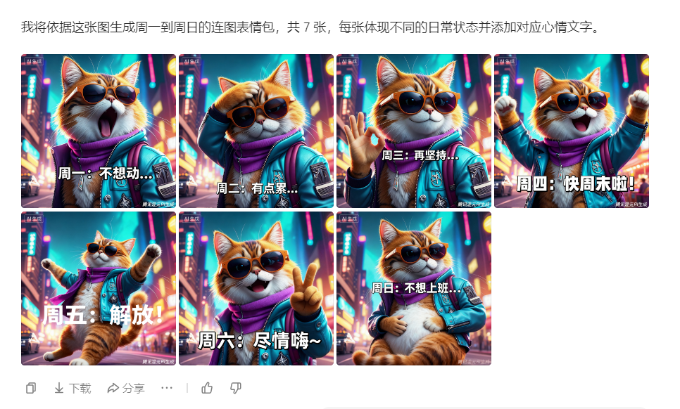 prompt:根据这张图生成7张周一到周日的连图表情包,并添加相应的心情文字
