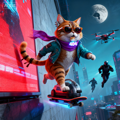 404 被无人机巡警发现并列为“非法情感造物”。追捕夜,朋克喵骑着用吸尘器改装的磁悬滑板,在垂直的广告屏墙面狂奔。它尾巴上的绷带被风撕成旗帜,404 被它叼在嘴里像一团发光的毛球。整座城市像坏掉的 GIF,一帧一帧掉色,而它们就是掉不下来的那两帧。在 0.3 秒的快门里,它们同时回头——瞳孔里倒映着彼此,也倒映着身后即将坠毁的月亮。