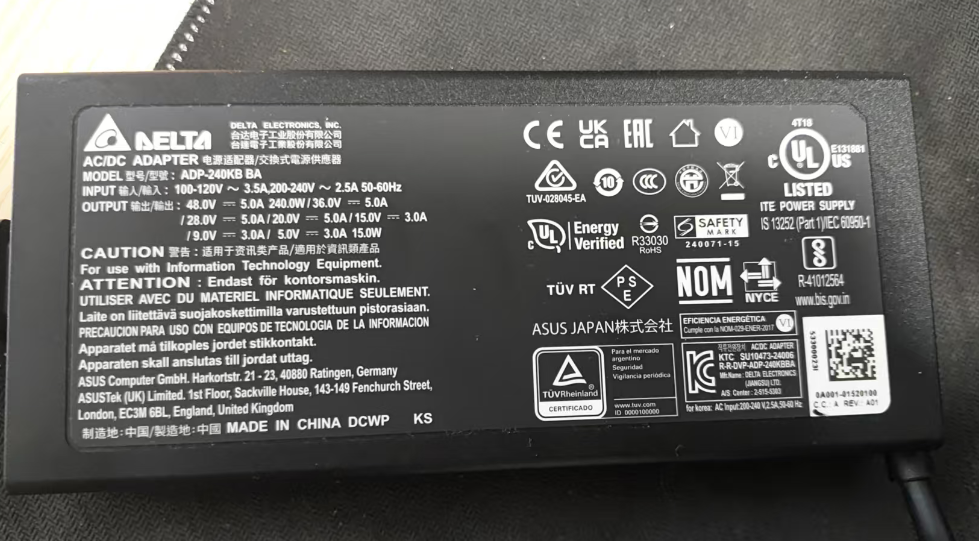 首先注意电源接的位置。配备的是台達電的 Type-C 介面 240W电源适配器。