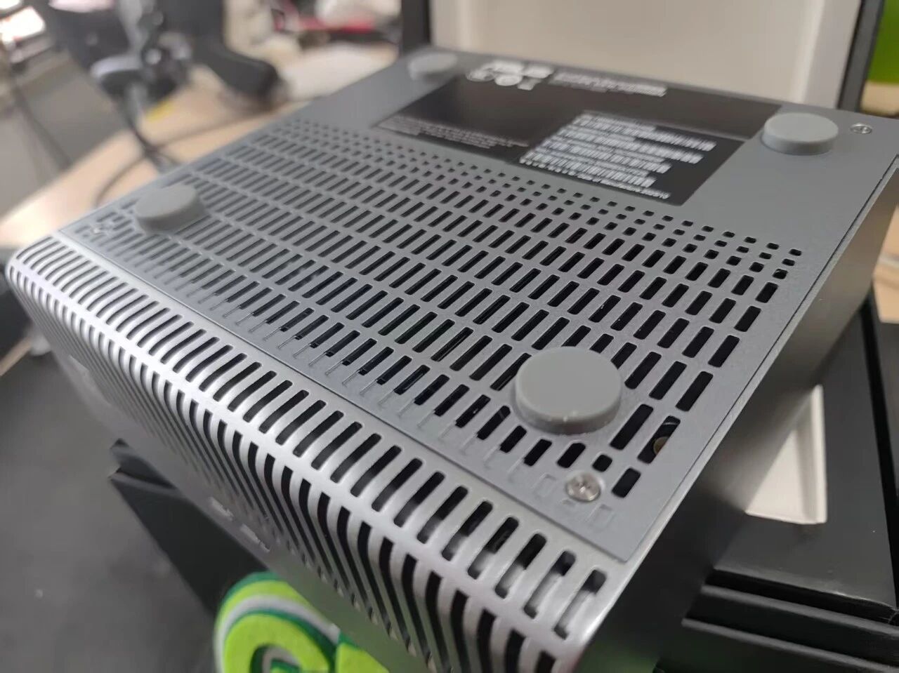 ASUS Ascent GX10以“光可鉴人”的视觉语言诠释高端AI设备的质感哲学——看小编的手都能显示出来。这种呈现镜面级光泽,在光线折射下形成流动的金属光晕,仿佛将星辰凝练于方寸之间,在光影流转间折射出细腻的金属拉丝质感。这种“镜面与纹理”的双重美学,既体现了华硕对工业设计的极致追求,又通过高光泽表面与精密工艺的融合,让设备在静止中透露出动态的光影生命力。