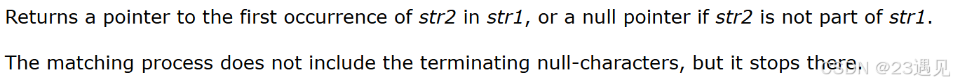 函数返回字符串str2在字符串str1中第一次出现的位置。字符串的比较匹配不包含\0字符,以\0作为结束标志。