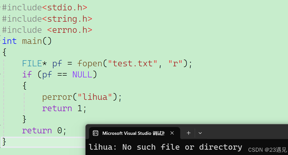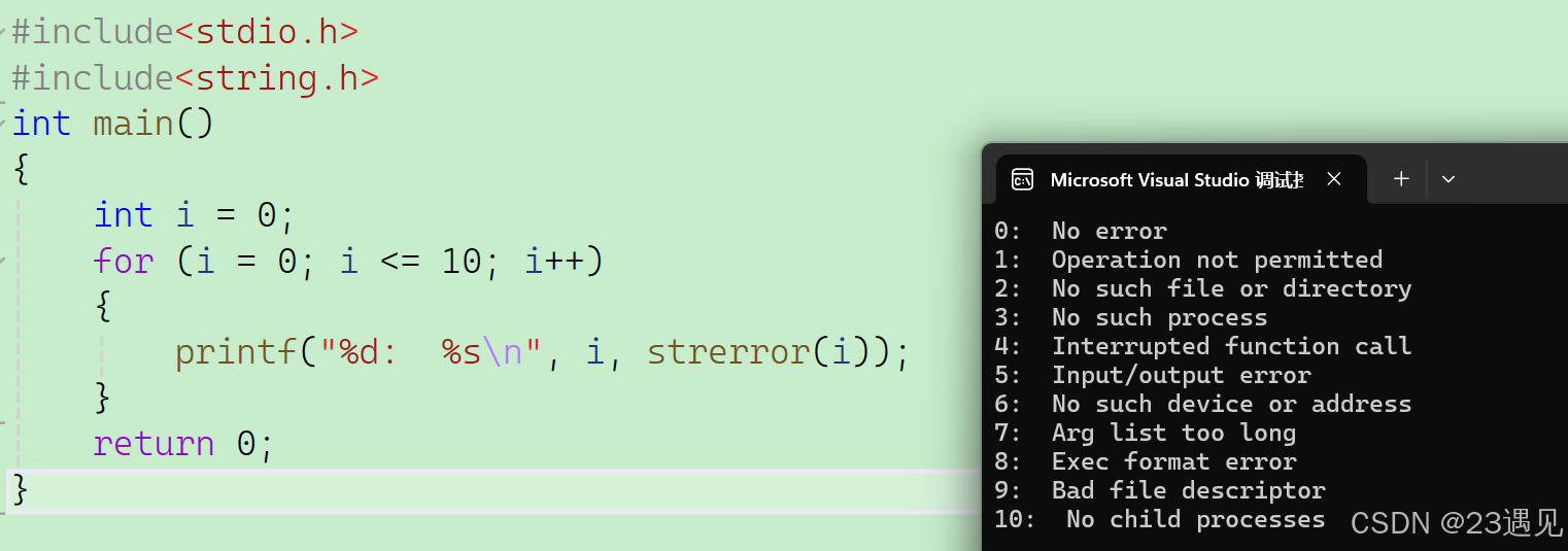 strerror函数可以把参数部分错误码对应的错误信息的字符串地址返回来。 在不同的系统和C语言标准库的实现中都规定了一些错误码,一般是放在 errno.h 这个头文件中说明的,C语言程序启动的时候就会使用一个全面的变量errno来记录程序的当前错误码,只不过程序启动的时候errno是0,表示没有错误,当我们在使用标准库中的函数的时候发生了某种错误,就会讲对应的错误码,存放在errno中,而一个错误码的数字是整数很难理解是什么意思,所以每一个错误码都是有对应的错误信息的。strerror函数就可以将错误对应的错误信息字符串的地址返回。