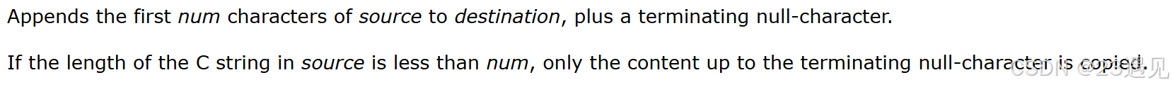 将source指向的字符串的前num个字符追加到destination指向的字符串末尾,再追加一个\0字符。如果source指向的字符串的长度小于num时,只会将字符串中到\0的内容追加到 destination指向的字符串末尾。