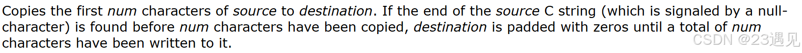 拷贝num个字符从源字符串到目的空间。 如果源字符串的长度小于num,则拷贝完源字符串后,在目标后面追加0,直到num个。