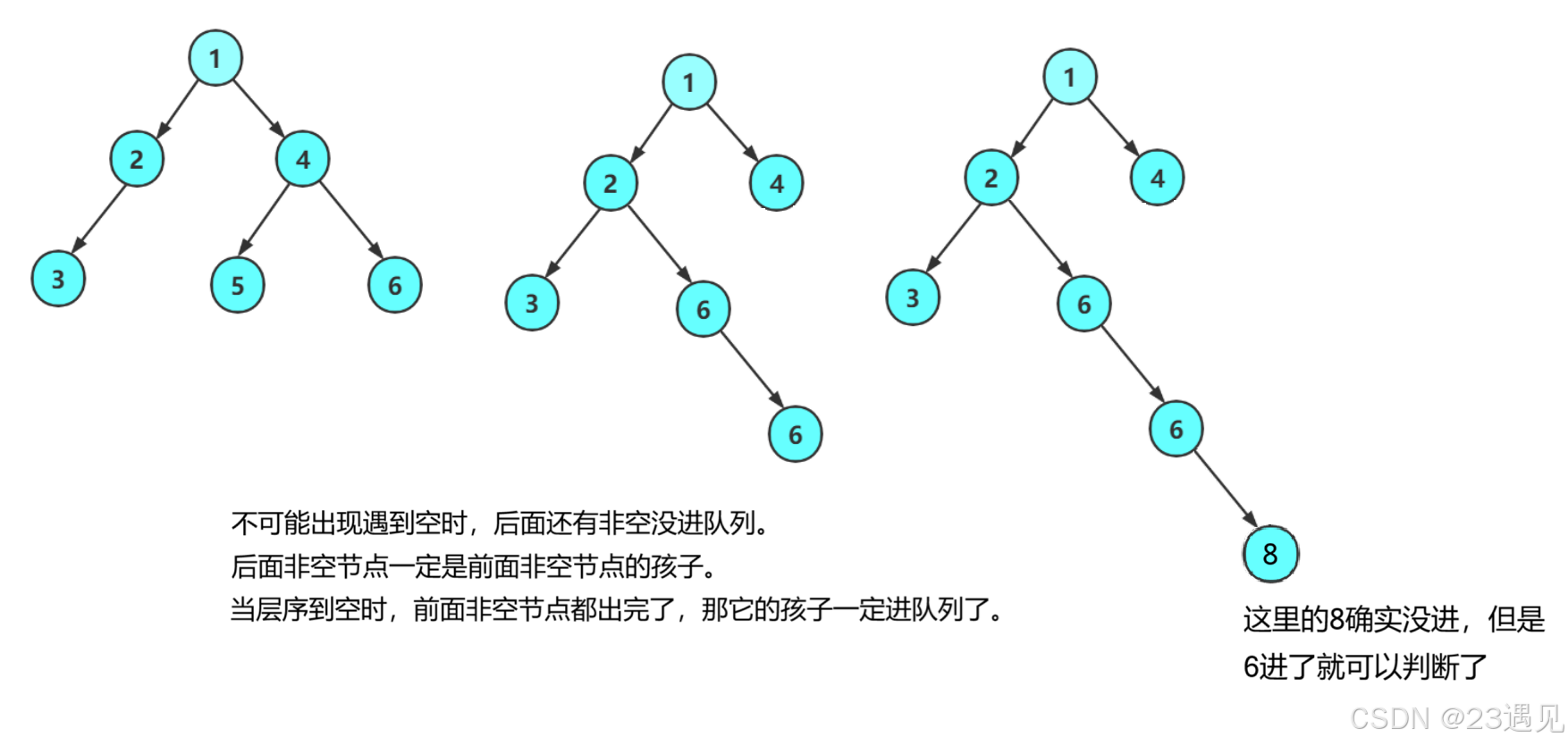 // 遇到第一个空,就可以开始判断,如果队列中还有非空,就不是完全二叉树